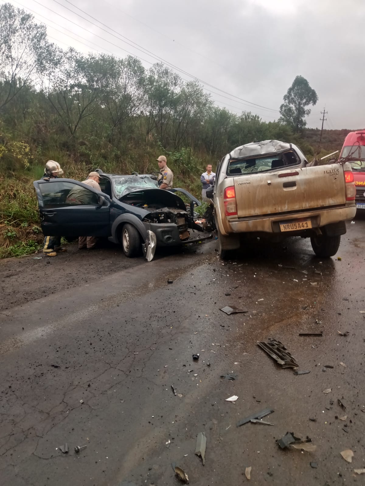 Houve colisão frontal envolvendo duas camionetas: uma Strada com placas de Salto do Lontra e uma Hilux de Ipuaçu-SC.