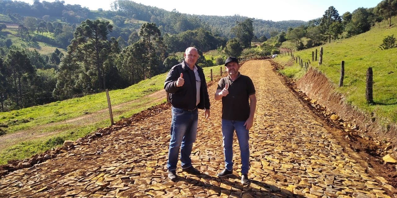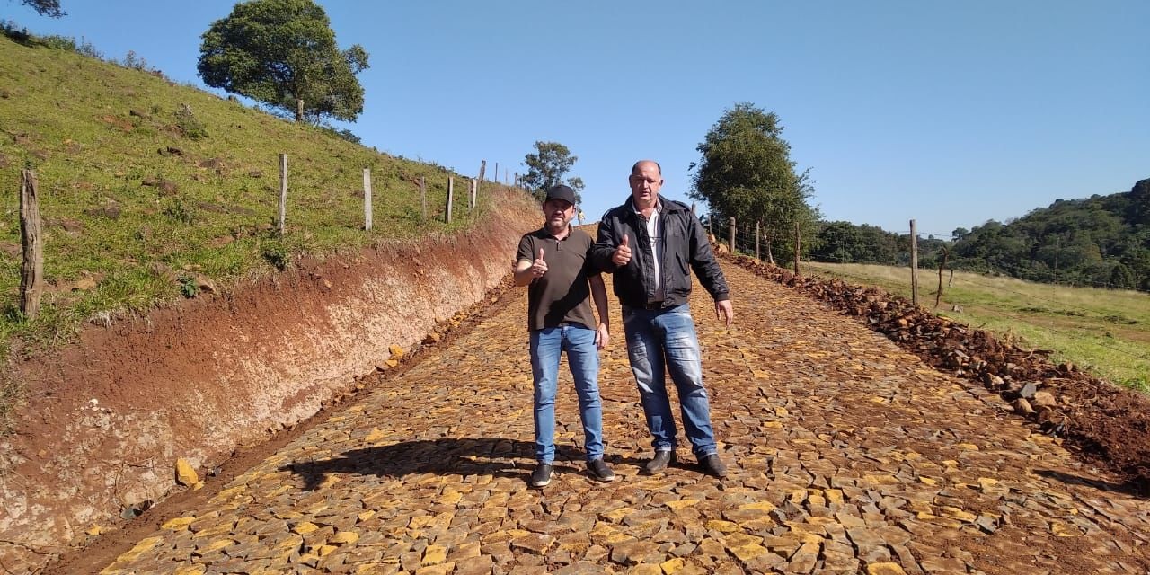 Nesta terça-feira (24), o prefeito esteve acompanhado do diretor do Departamento de Viação, Cirineu Bonetti - o Tatão - e juntos estiveram acompanhando e vistoriando a obra de pavimentação poliédrica (calçamento) que está em andamento na estrada que liga a comunidade de Rio Caveirinha e KM 38.
