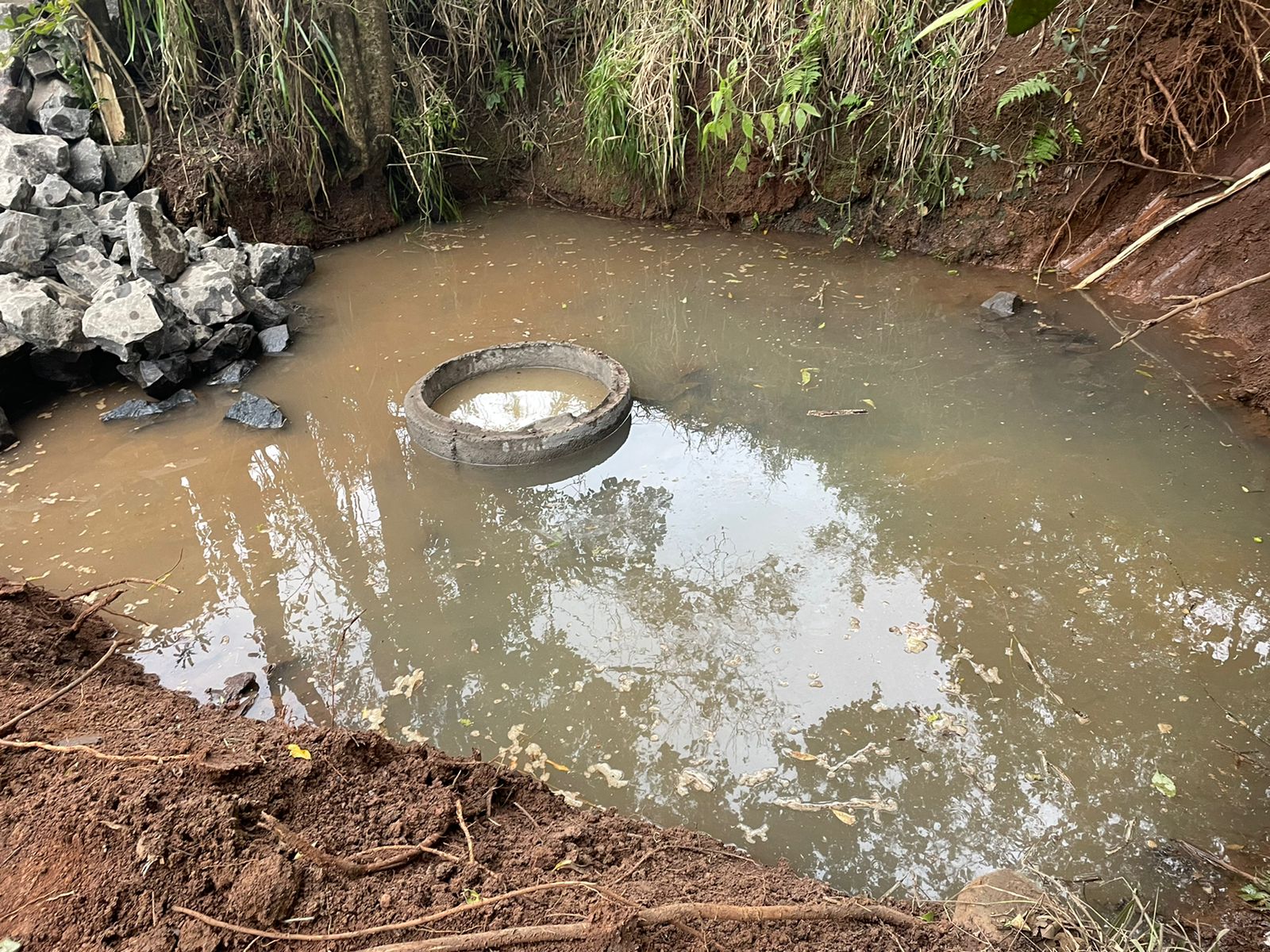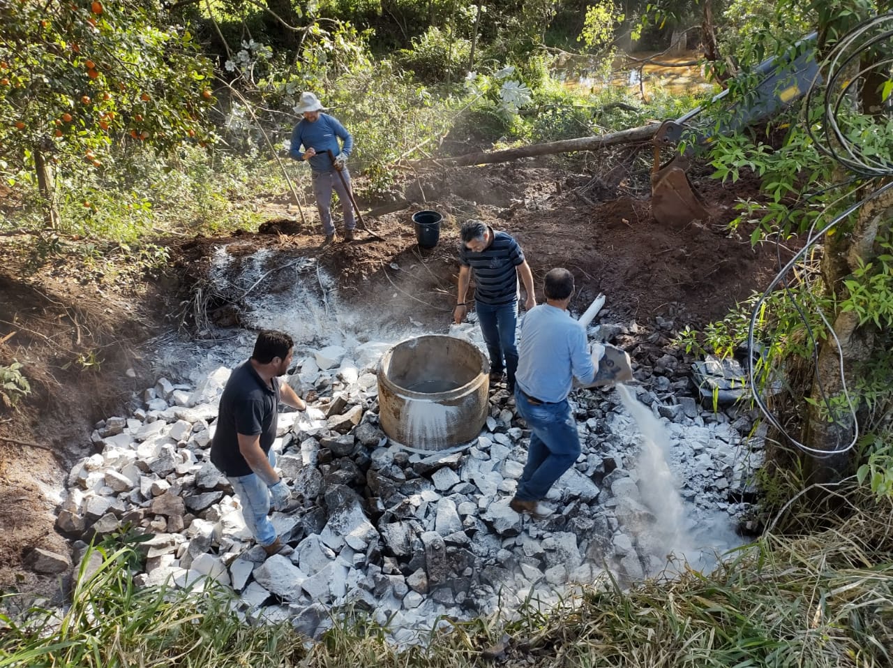 Para o trabalho foram utilizados 2 tubos de concreto de 800 milímetros, 19 metros cúbicos de pedra (rachão), lona para a vedação e cal.
