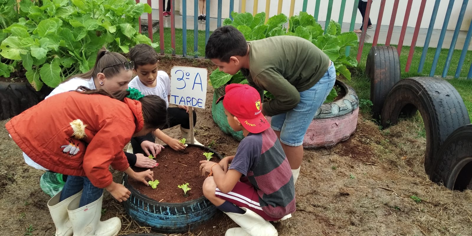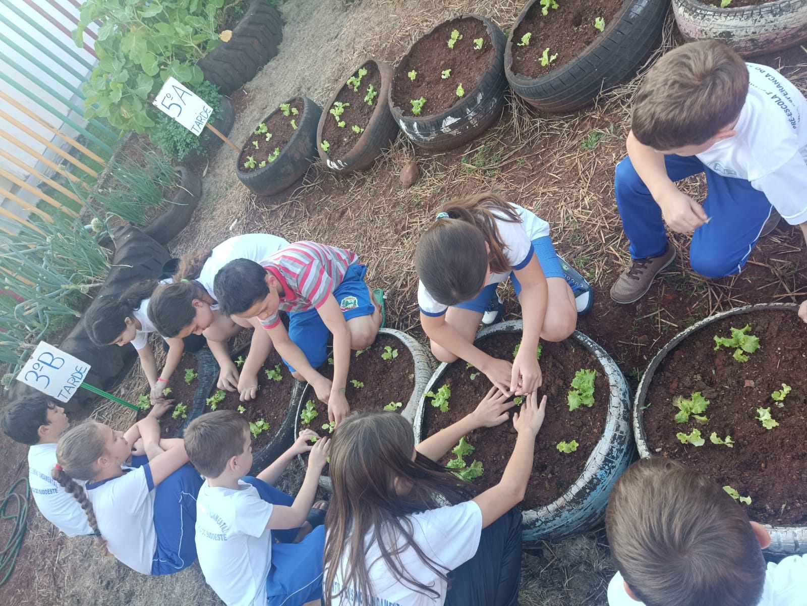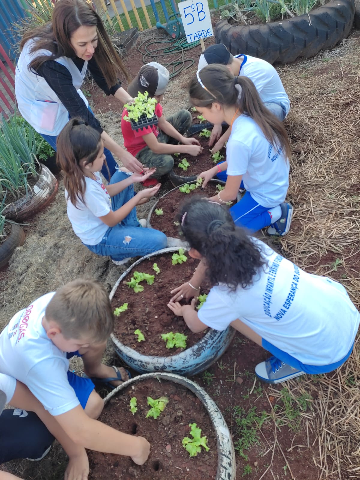 A Escola Municipal Professora Marlene Aguiar de Souza de Nova Esperança do Sudoeste está desenvolvendo o projeto Horta na Escola, que visa o plantio e cultivo de horta com a participação dos alunos do 3º, 4º e 5º ano. Primeiramente as crianças participaram de uma palestra com a nutricionista Carla Koerich que reforçou a importância de uma alimentação saudável. Na sequência todos foram até a horta, que havia sido previamente preparada pelo funcionário Adejalmo, e ajudaram no plantio das mudinhas dentro de pneus, que serão cuidadas por eles até o momento da colheita.