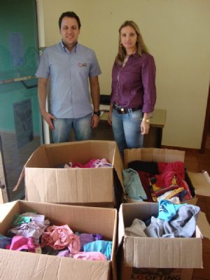 Na foto o Diretor das Rádios Independência AM e Tropical Sul FM, Roberto Maria entregando agasalhos para a Primeira Dama e Coordenadora da Assistência Social de Salto do Lontra, Susana Baldessar Bau.