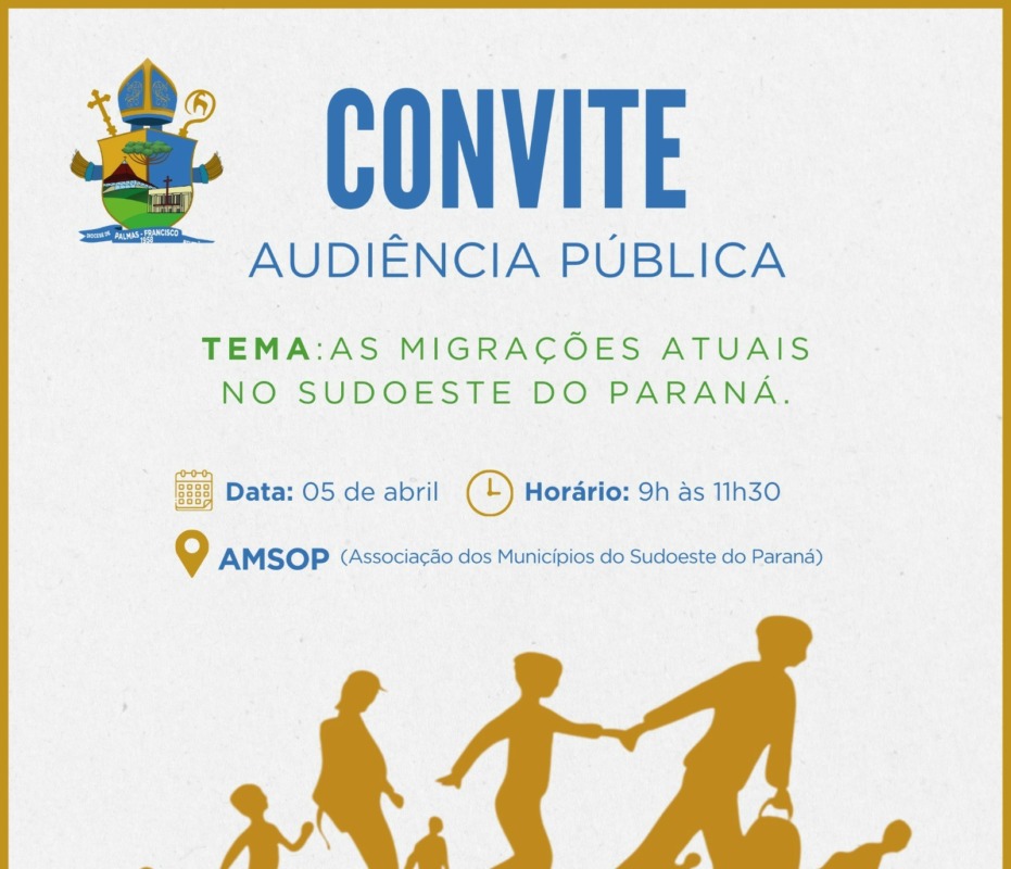 A Diocese de Palmas-Francisco Beltrão realizará nesta sexta-feira, 05 de abril, Audiência Pública sobre o tema “Migrações atuais no Sudoeste do Paraná”. Será na AMSOP – Associação dos Municípios (Francisco Beltrão), com início às 9h e conclusão às 11h30min.