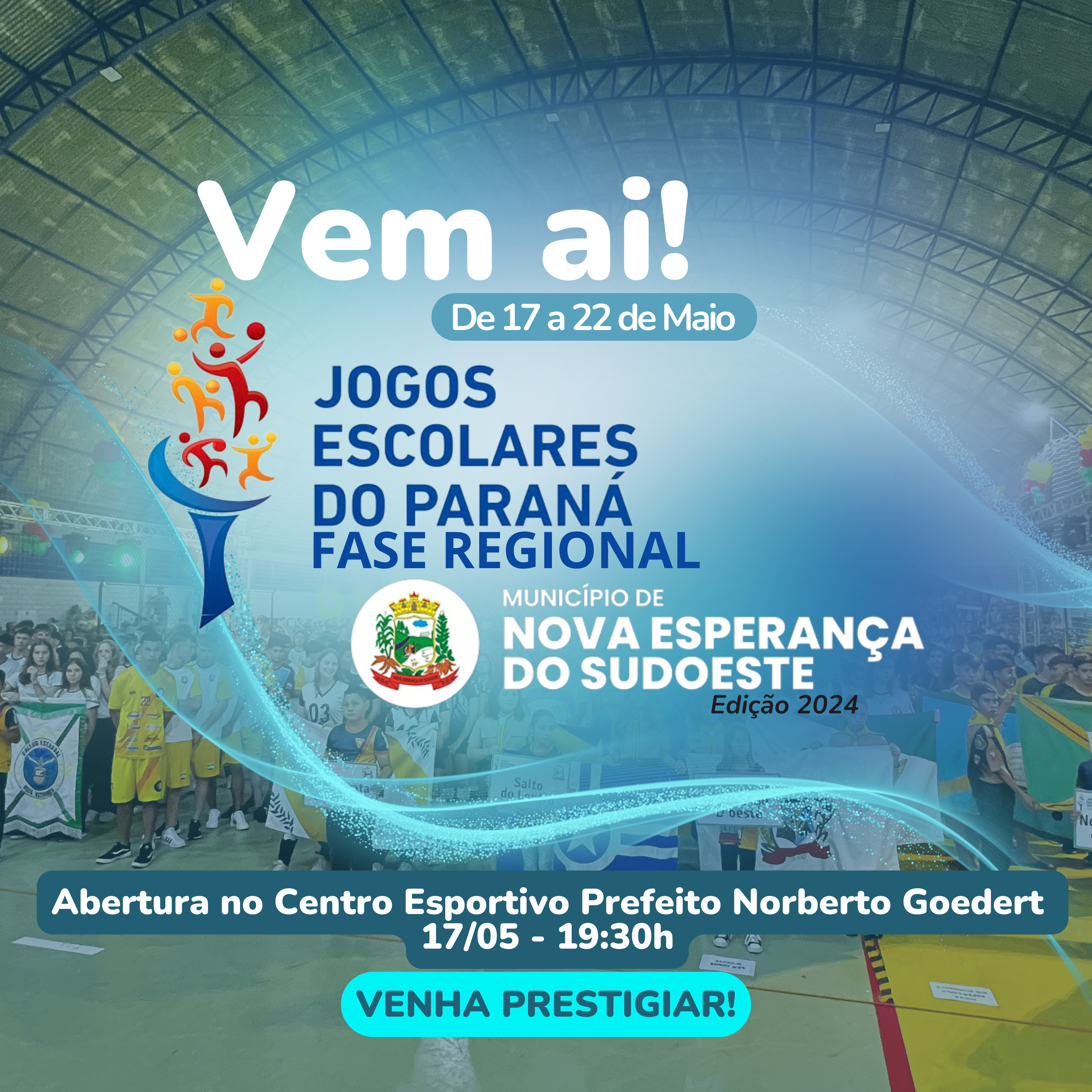 De 17 a 22 de maio Nova Esperança do Sudoeste vai sediar, pelo segundo ano seguido, os Jogos Escolares-Fase Regional. Alunos dos municípios de São Jorge do Oeste, Dois Vizinhos, Cruzeiro do Iguaçu, Boa Esperança do Iguaçu, Nova Prata do Iguaçu, Salto do Lontra e Nova Esperança do Sudoeste disputarão as modalidades de futsal, voleibol, tênis de mesa, xadrez e atletismo. A abertura oficial dos jogos acontece nesta sexta-feira, 17, a partir das 19:30h no Centro Esportivo Prefeito Norberto Goedert.