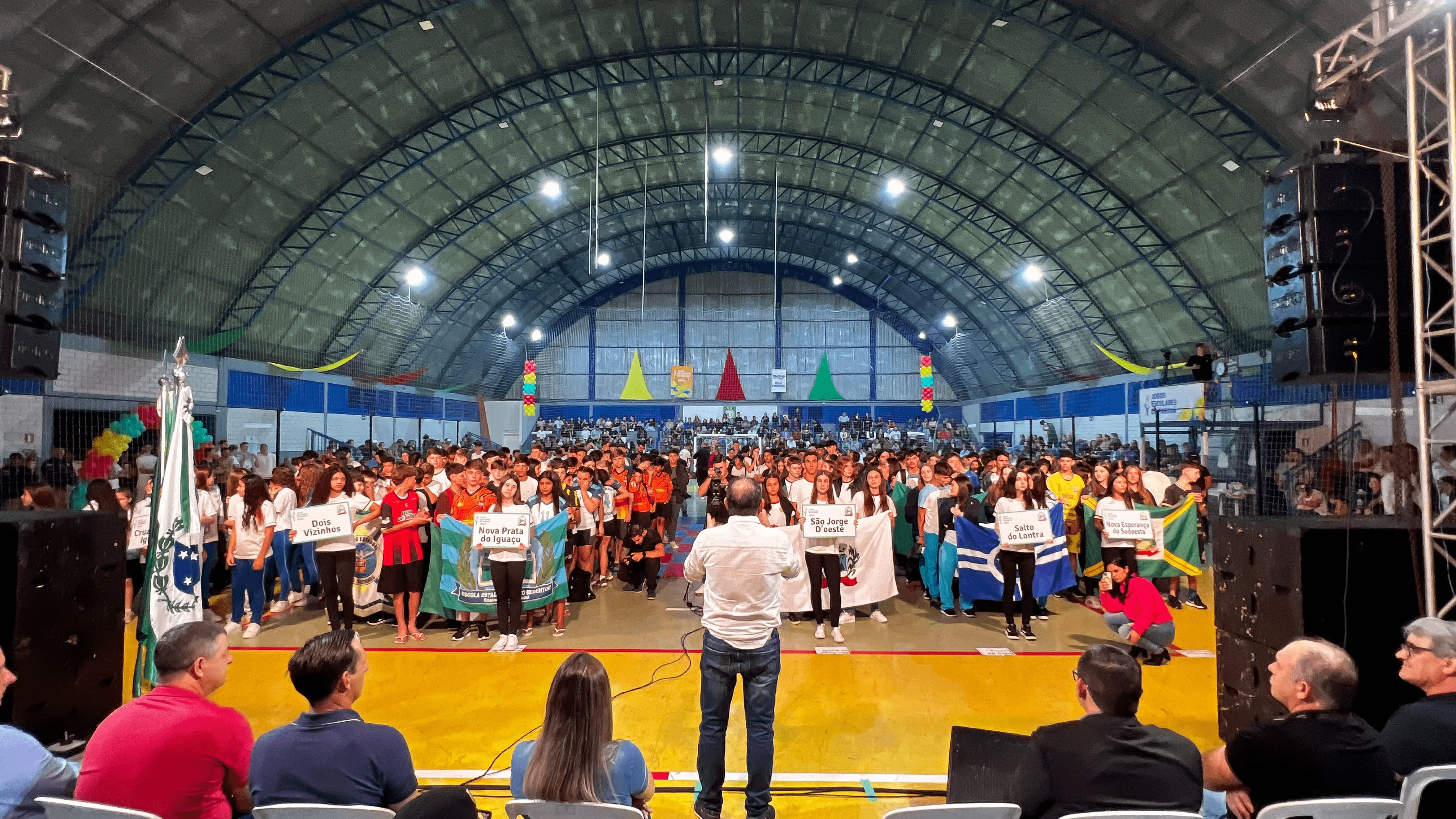 Uma noite repleta de encanto e emoção. Assim foi a última sexta-feira, 17, no Centro Esportivo Prefeito Norberto Goedert em Nova Esperança do Sudoeste, onde foi realizada a abertura dos 70º Jogos Escolares do Paraná, fase Regional. O local ficou completamente lotado de munícipes, professores, diretores e alunos dos municípios de São Jorge do Oeste, Dois Vizinhos, Cruzeiro do Iguaçu, Boa Esperança do Iguaçu, Nova Prata do Iguaçu, Salto do Lontra e Nova Esperança do Sudoeste.