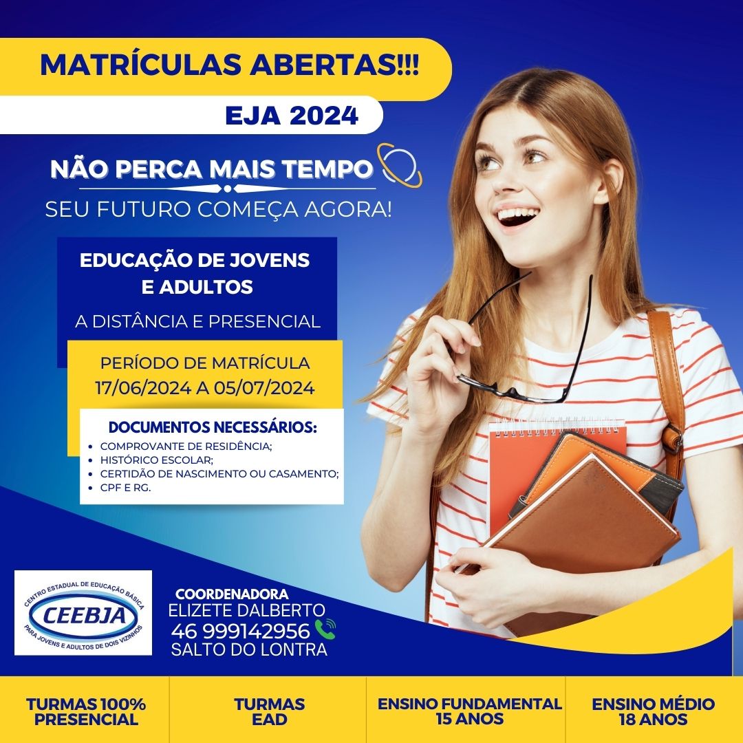 Estão abertas as matrículas para a Educação de Jovens e Adultos (EJA) 2024 em Salto do Lontra. O prazo vai até 05 de julho.