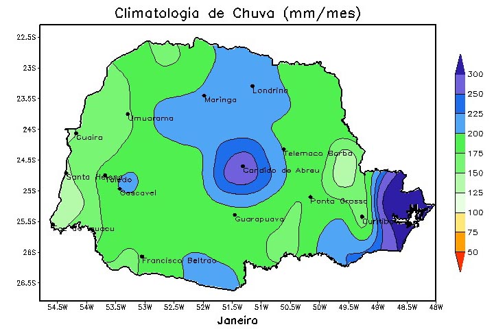 "O mapa de janeiro da climatologia mostra que temos previsão de chuvas de mais de 200 mm entre o Centro e o Norte do Estado. Onde mais chove nesta época do ano é a região litorânea, com mais de 300 mm ao longo dos próximos meses", afirma o meteorologista do Simepar, Reinaldo Kneib. De acordo com mapa, no Oeste as chuvas variaram de 146 mm a 179 mm na média histórica de janeiro, e no Norte de 129 mm 203 a mm em fevereiro.