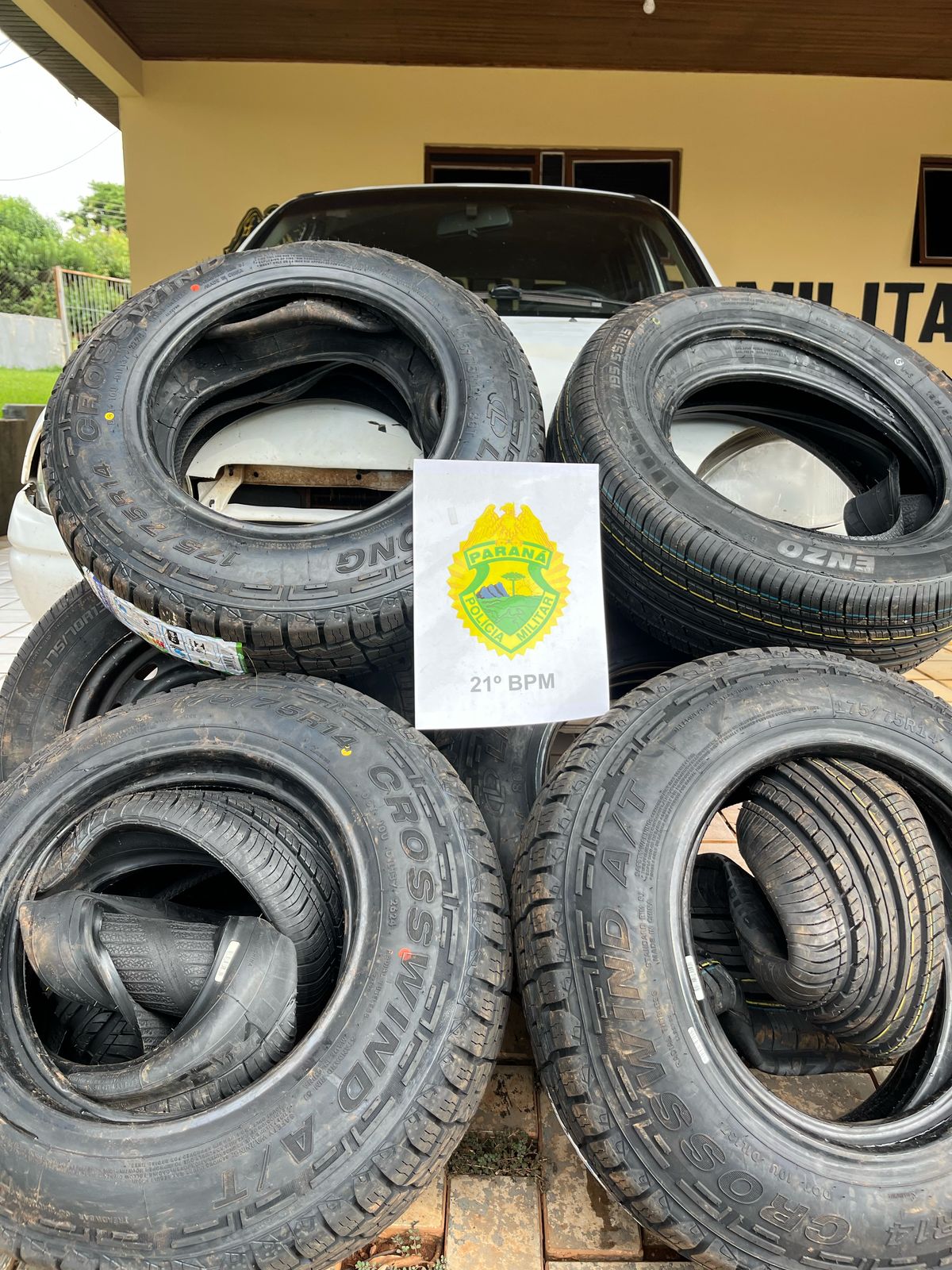 Em patrulhamento a fim de combater o transporte de ilícitos na região, na tarde desta quarta-feira, 12, a Polícia Militar de Nova Prata do Iguaçu abordou um Corsa, ocupado por um casal, com um pano tampando produtos no porta-malas e no banco traseiro. No veículo foram localizados 18 pneus novos, os quais o motorista disse que comprou no Paraguai.