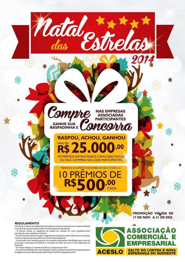 O presidente da Aceslo, Roberto Manfroi Maria, explica que a promoção foi reformulada neste ano e contou com raspadinhas premiadas. As empresas participantes distribuíram aos clientes mais de R$ 25 mil em raspadinhas com prêmios instantâneos. Os valores variaram de R$ 5,00 a R$ 100,00 e foram revertidos em descontos ou vale-compras no próprio comércio. As raspadinhas envolveram empresas e consumidores em um clima divertido de Natal, no qual muitas pessoas foram contempladas, estimulando assim a compra de presentes e a movimentação no comércio, analisa Roberto.