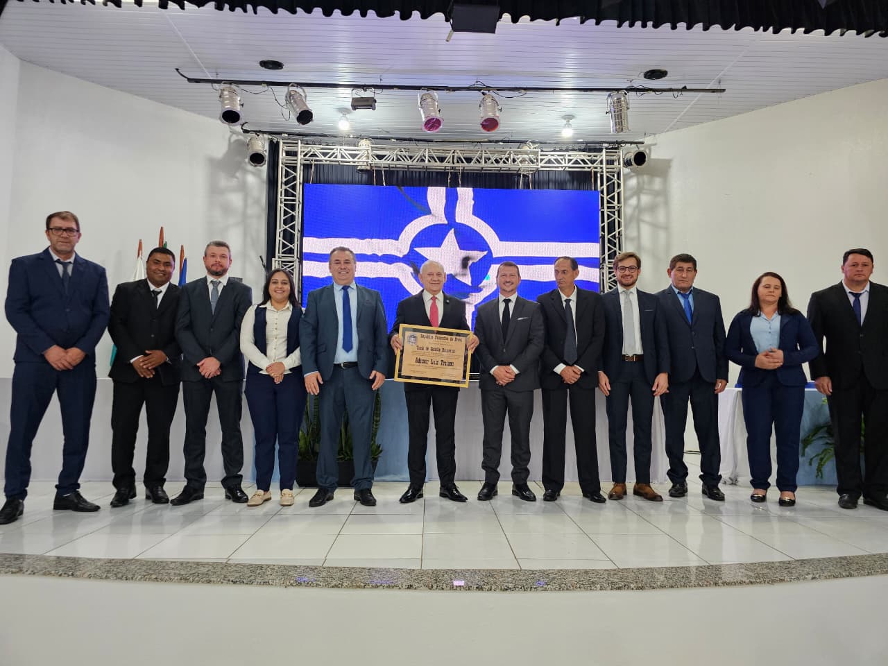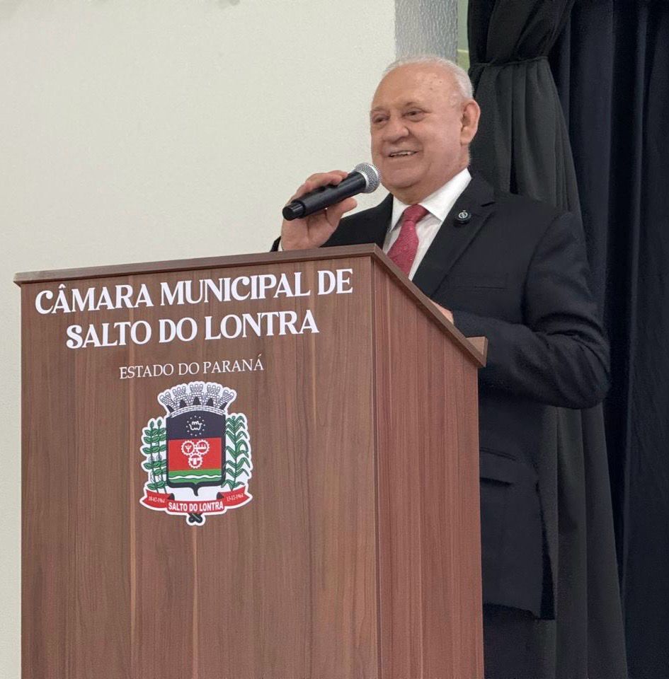Com a presença de várias autoridades e com o Centro de Eventos de Salto do Lontra lotado, aconteceu na noite desta sexta-feira, 24, sessão solene da Câmara de Vereadores para a entrega de Título de Cidadão Honorário do Município ao deputado estadual Ademar Luiz Traiano.