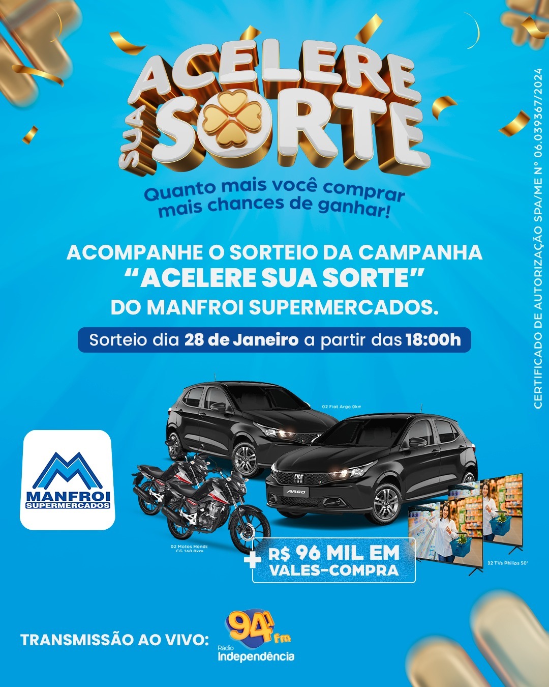 O sorteio acontece a partir das 18h, na matriz do Manfroi Supermercados, em Salto do Lontra, e poderá ser acompanhado ao vivo no local, pela Rádio Independência e também pelas redes sociais da rádio e do supermercado.