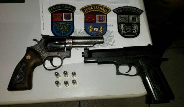 Concomitantemente, outra equipe cumpriu os mandados na Rua InêsSokowoski, Bairro Cophareal, Realeza. No local, foi encontrado um homem e uma menor, a qual disse que havia pernoitado na companhia do detido. Iniciadas as buscas, foram apreendidos junto aos pertences do investigado um revólver calibre 38, marca Rossi, municiado com cinco cartuchos. Também foi encontrado munições calibre .357, marca CBC de uso restrito e mais uma munição calibre .32 encontrada no roupeiro do quarto. Um espingarda de pressão, marca CBC, calibre 6 mm e um invólucro de plástico com substância análoga a cocaína pesando aproximadamente três gramas. O suspeito foi conduzido com a droga e as armas apreendidas para à Delegacia de Polícia Civil.