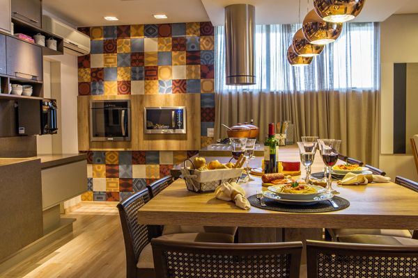 Como revestimento, destaca-se o uso do ladrilho português que imprime texturas étnicas, trazendo a sensação de família por meio dos traços que remetem a história e antiguidade dos desenhos primários. O toque de cor dos azulejos também contribuem para o aconchego e aguçam o paladar dos convidados.