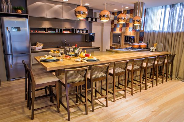 O layout da cozinha em ilha possibilitou o uso de banquetas frontais e, ainda, um espaço na lateral abriga outras seis pessoas, que podem se sentar juntas, o que totaliza onze lugares. Nesse ambiente, grande parte do mobiliário foi produzido com a tecnologia Push to Open ou Fecho Toque, que permite abertura de portas e gavetas apenas com um toque, sem o uso de puxadores. A bancada e a cuba foram feitas em Ceaserstone, uma pedra mista que facilita cortes, moldagem e perfeição nas emendas. Ao se ter a própria cuba em pedra, facilita-se também a higiene e proporciona-se um aspecto ainda mais moderno ao móvel.