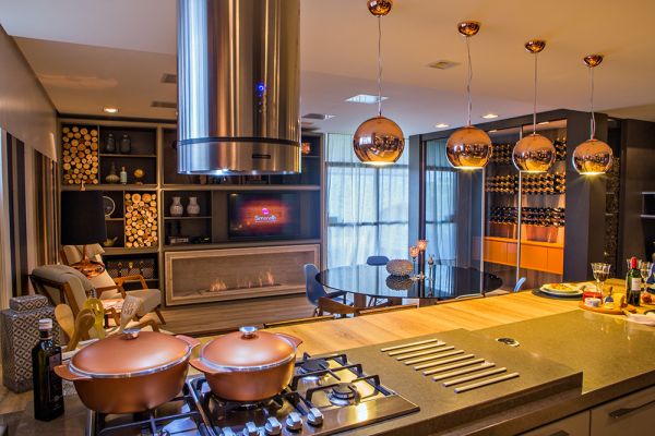 Na decoração, pontos chamativos na cor cobre combinam com outros elementos do ambiente, como as luminárias pendentes da ilha, a coluna de iluminação entre as poltronas da biblioteca, as panelas e os azulejos do revestimento em ladrilhos.