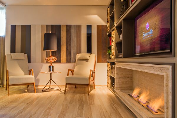 No ambiente, projetado pela designer de interiores da Simonetto, Luana Freire, três padrões de cores em MDF da marca predominam: o Fendi (tom nude com textura metalizada), o Cobre (tom terroso com textura também metalizada) e o Arenal (tom e textura de madeira natural). Segundo a profissional, a escolha da paleta de cores dos móveis se ateve às tendências mundiais apresentadas na mais recente edição da Isaloni, feira internacional do móvel de Milão, quanto a predominância de tons unicolores com amadeirados em segundo plano.