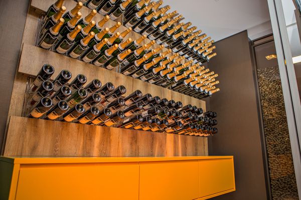 A adega se separa do ambiente por amplas portas em perfil alumínio com vidros na cor fumê, assim, o cantinho dos vinhos fica livre da claridade fazendo com que a bebida seja melhor conservada, mas ainda assim pode ser visualizada de fora para dentro, com toda a beleza dos aramados utilizados e do balcão em lacca na cor laranja.