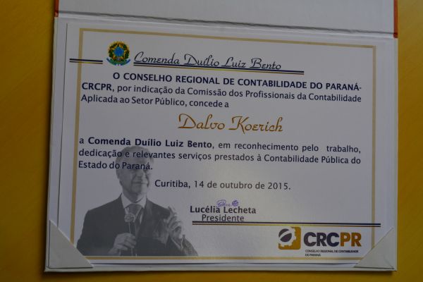 O Contador Dalvo koerich, de Salto do Lontra, recebeu no último dia 14/10/2015, na cidade de Maringá Paraná - a Comenda Duílio Luiz Bento, em reconhecimento pelo Trabalho e relevantes serviços prestado a contabilidade Pública do Paraná.