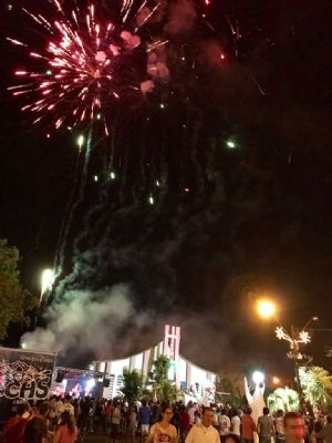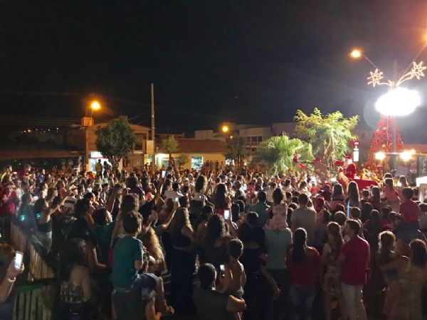 teve pronunciamentos de autoridades, chegada do Papai Noel, queima de fogos e acendimento das luzes