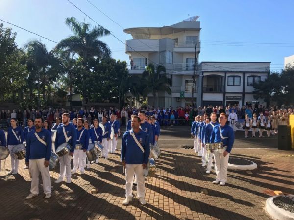 Estadual e Municipal, entrada das bandeiras das escolas ao som da Banda Municipal, execução dos