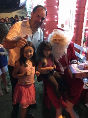 chegada do Papai Noel, entrega de brinquedos e doces para as crianças, e show com a Banda Ministério