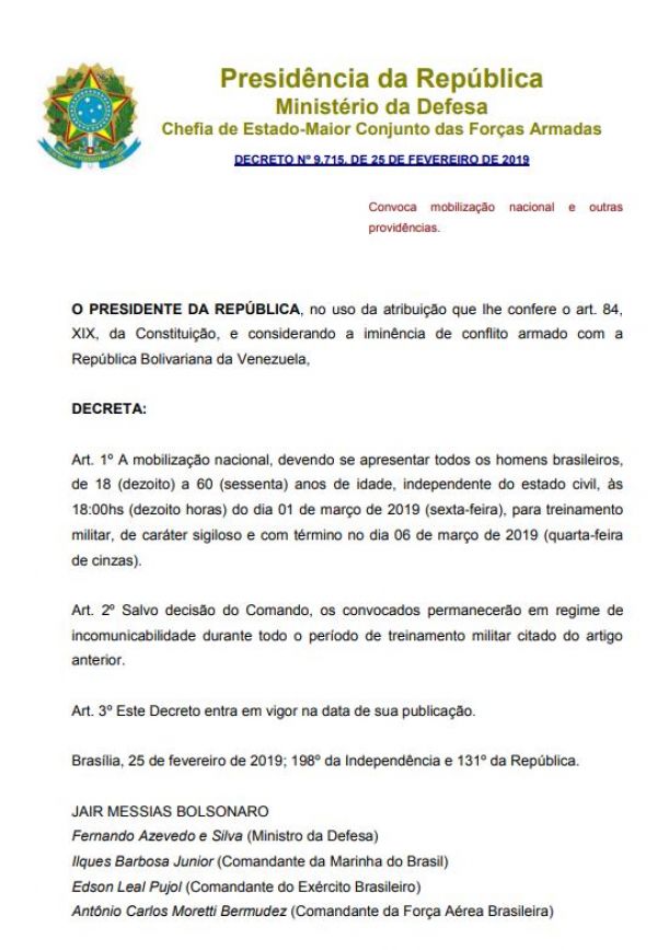 dias 1º e 6 de março devido ao iminente conflito armado com a República Bolivariana da Venezuela.