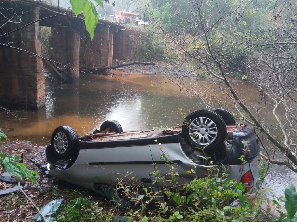 Um veículo Palio caiu de uma ponte no final da manhã de hoje (08), na estrada de acesso à comunidade de São Sebastião, interior de Salto do Lontra.