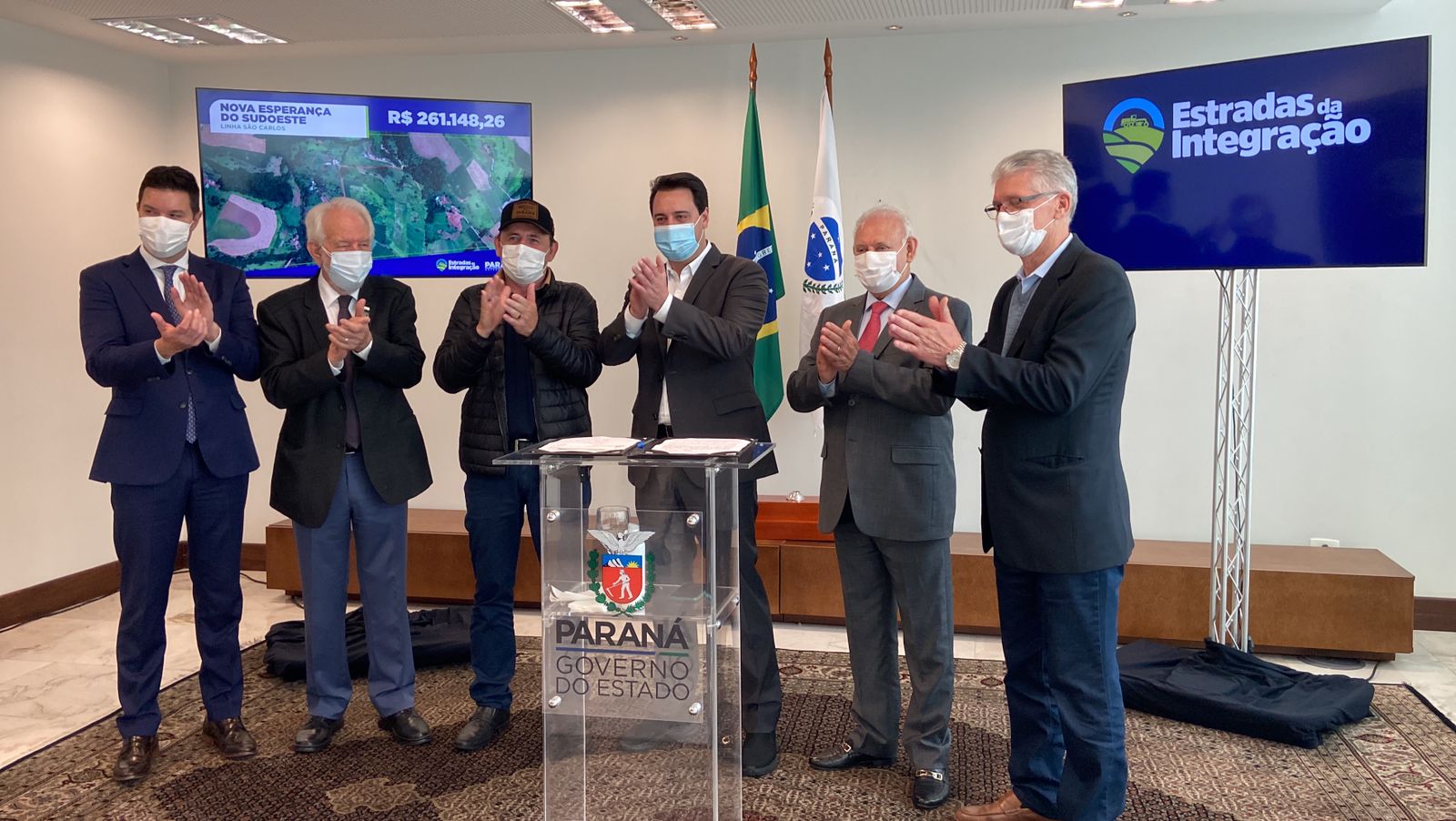 A solenidade de assinatura contou com a participação do Governador Carlos Massa Ratinho Junior, vice-governador, Darci Piana, secretário da Casa Civil, Guto Silva, secretário da Agricultura, Norberto Ortigara e Deputado Ademar Traiano.