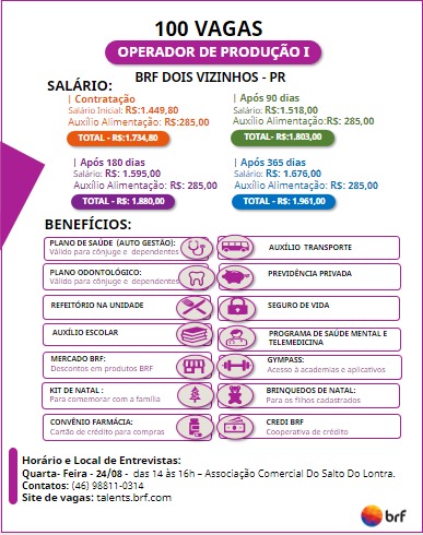 BRF de Dois Vizinhos está com 100 vagas abertas para operador de produção I