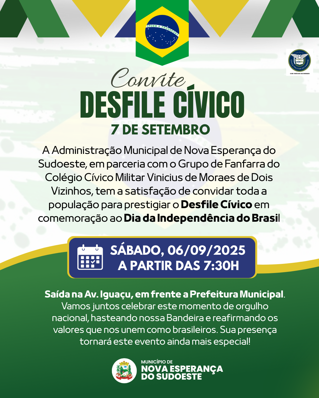 Neste sábado será realizado o Desfile Cívico em Nova Esperança do Sudoeste; já em Salto do Lontra, a programação acontece no domingo