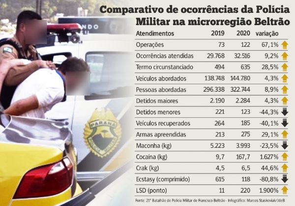 No Estado, as ocorrências da Polícia Militar diminuíram, mas na área do 21º BPM tiveram acréscimo entre 2019 e 2020.