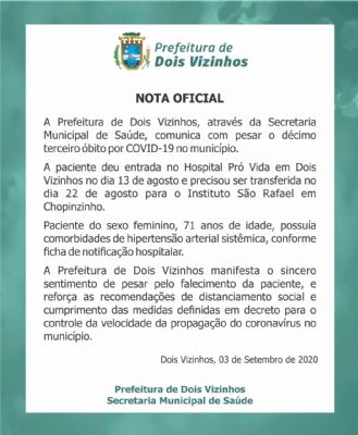 Confirmado décimo terceiro óbito por COVID-19 em Dois Vizinhos