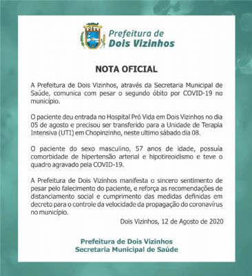 Confirmado terceiro óbito por Covid-19 em Dois Vizinhos