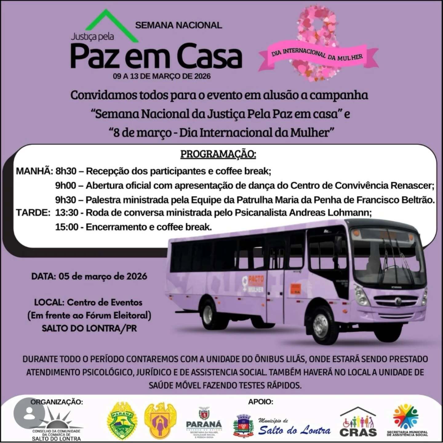 Salto do Lontra promove evento alusivo à Justiça pela Paz em Casa e ao Dia Internacional da Mulher